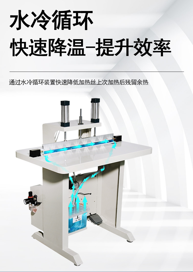 - 啟動封口:踩下腳踏開關(guān)或按下操作面板上的封口按鈕,封口壓頭在氣缸(或其他動力裝置)推動下下壓,包裝袋與加熱的封口條緊密貼合,封口處塑料受熱熔融;與此同時,水冷系統(tǒng)同步運行,帶走熱量促使封口快速冷卻定型。