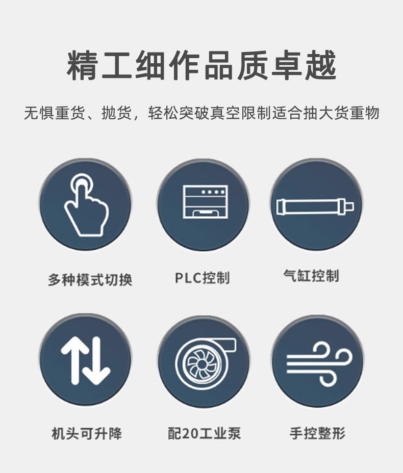 • 適應性強:得益于升降工作臺和立式結構,對包裝物品的形狀、尺寸、重量兼容性極高,解決了傳統固定高度真空包裝機的局限,不管是異形還是超大尺寸產品,都能應對自如。
