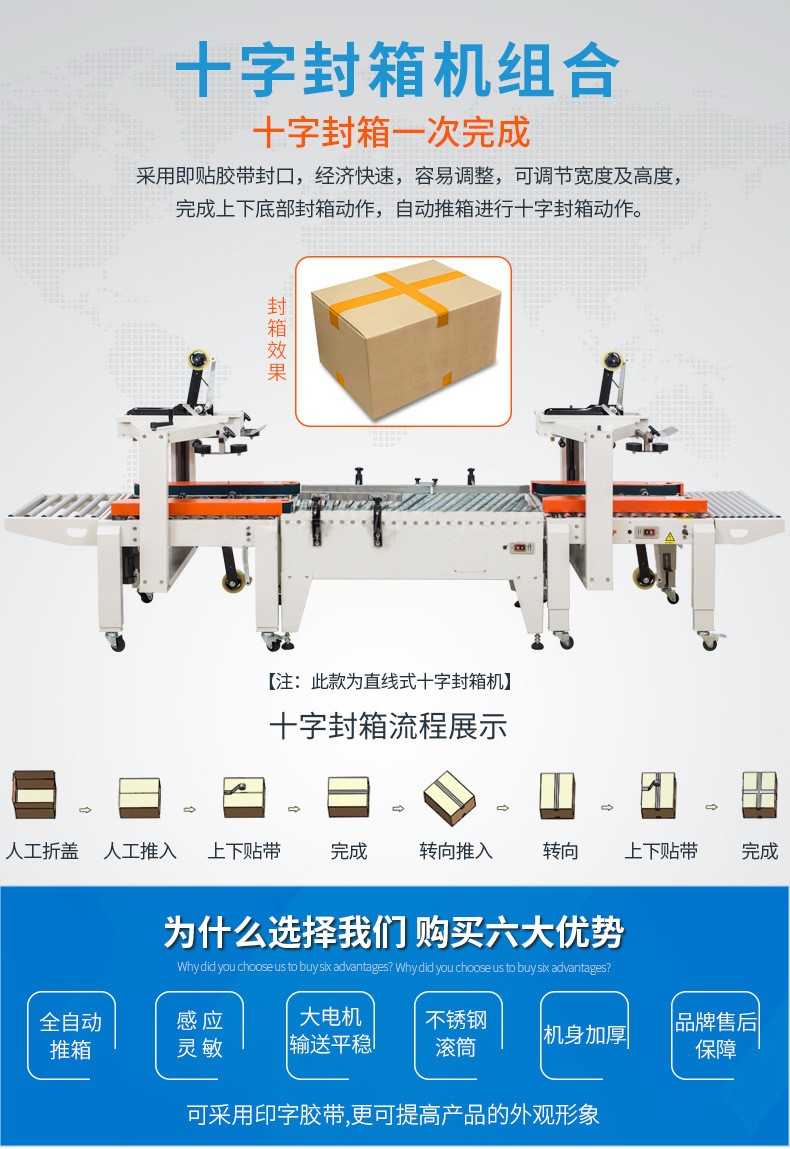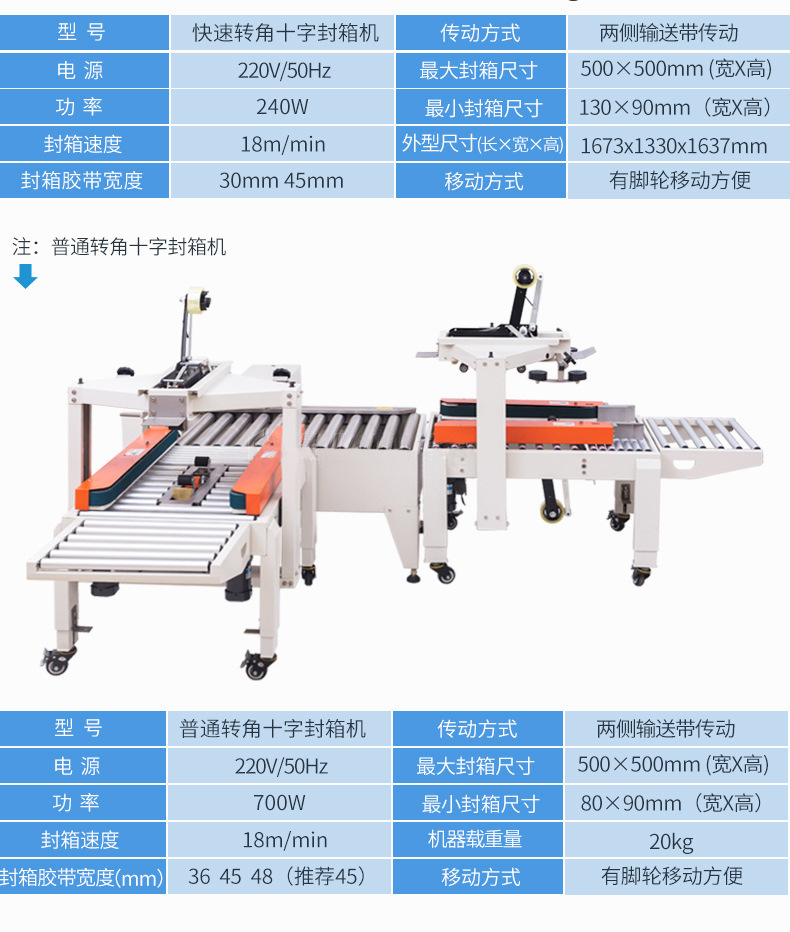 - 紙箱尺寸:超出十字封箱機可調節范圍的紙箱尺寸,設備難以正常工作。如紙箱過長、過寬或過高,輸送系統無法順利輸送,升降機構也無法精準調整高度,進而影響膠帶的粘貼位置和效果。