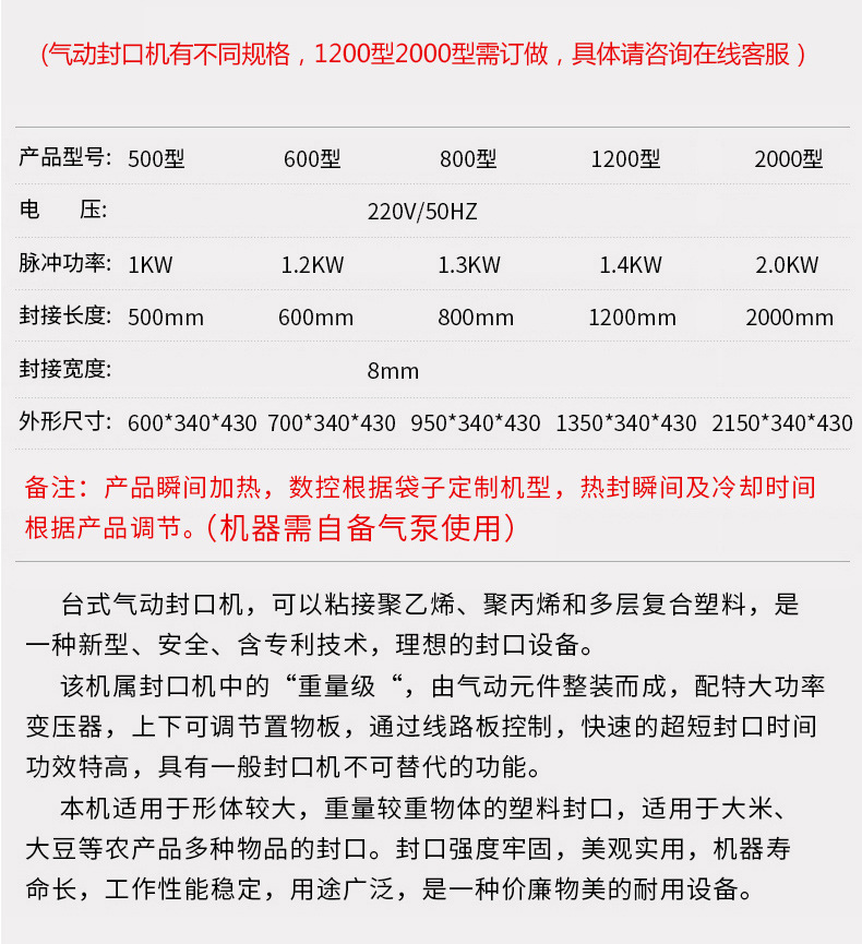 • 設備性能:優質的臺式氣動封口機配備高性能的氣動系統和加熱系統,能夠實現快速的封口動作和穩定的溫度控制。例如,一些高端型號采用先進的氣動元件,響應速度快,氣缸運動平穩,可有效縮短封口周期。同時,高效的加熱系統能在短時間內達到并保持合適的封口溫度,提高每次封口的效率。