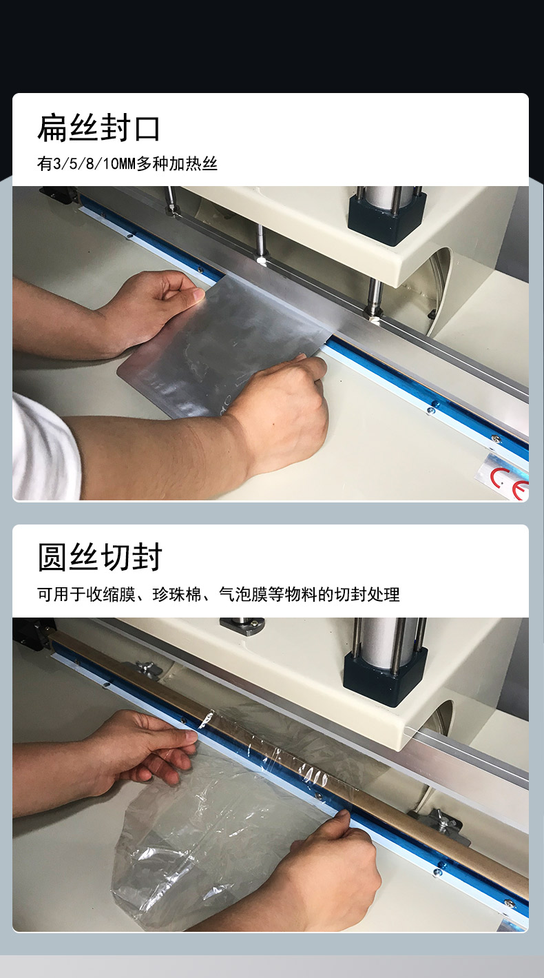 • 氣動水冷封口機:采用氣動系統作為動力源,通過壓縮空氣驅動氣缸帶動壓板進行封口操作。這種動力方式能夠提供較為穩定且較大的壓力,保證封口時壓板對包裝材料的壓合力度均勻一致。