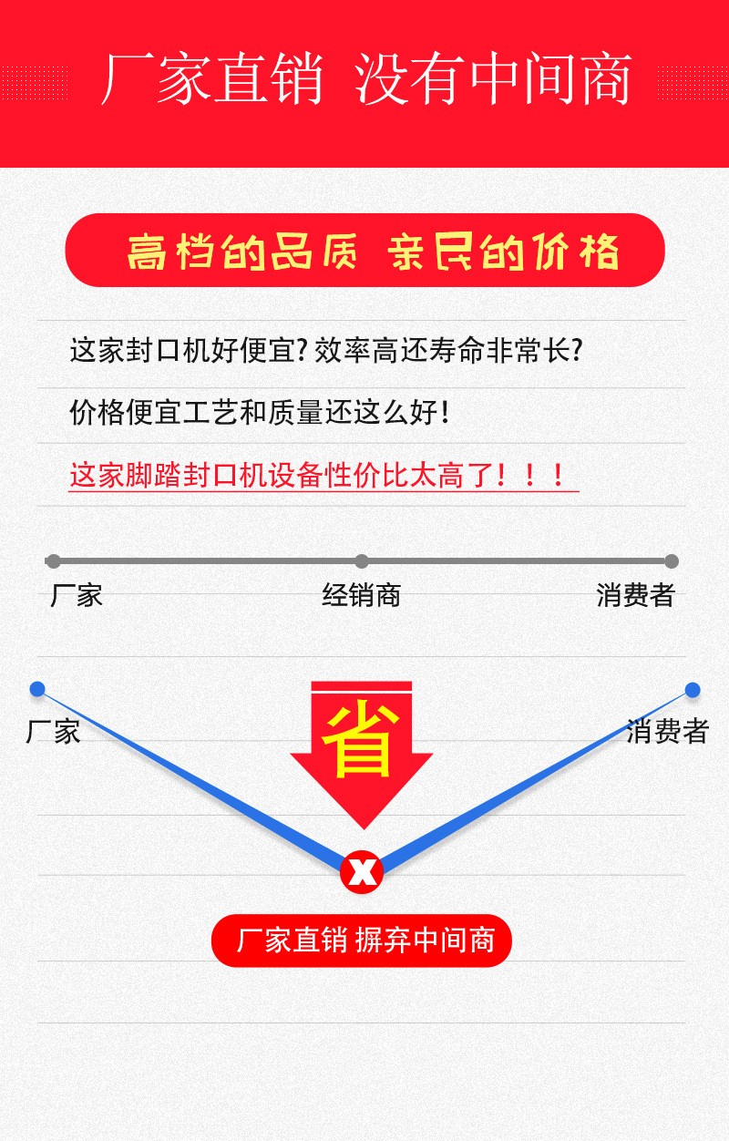 - 設備成本低:相比一些全自動的封口設備,腳踏封口機結(jié)構(gòu)相對簡單,價格較為低廉,對于小型企業(yè)、家庭作坊或預算有限的用戶來說,是一種性價比高的選擇。