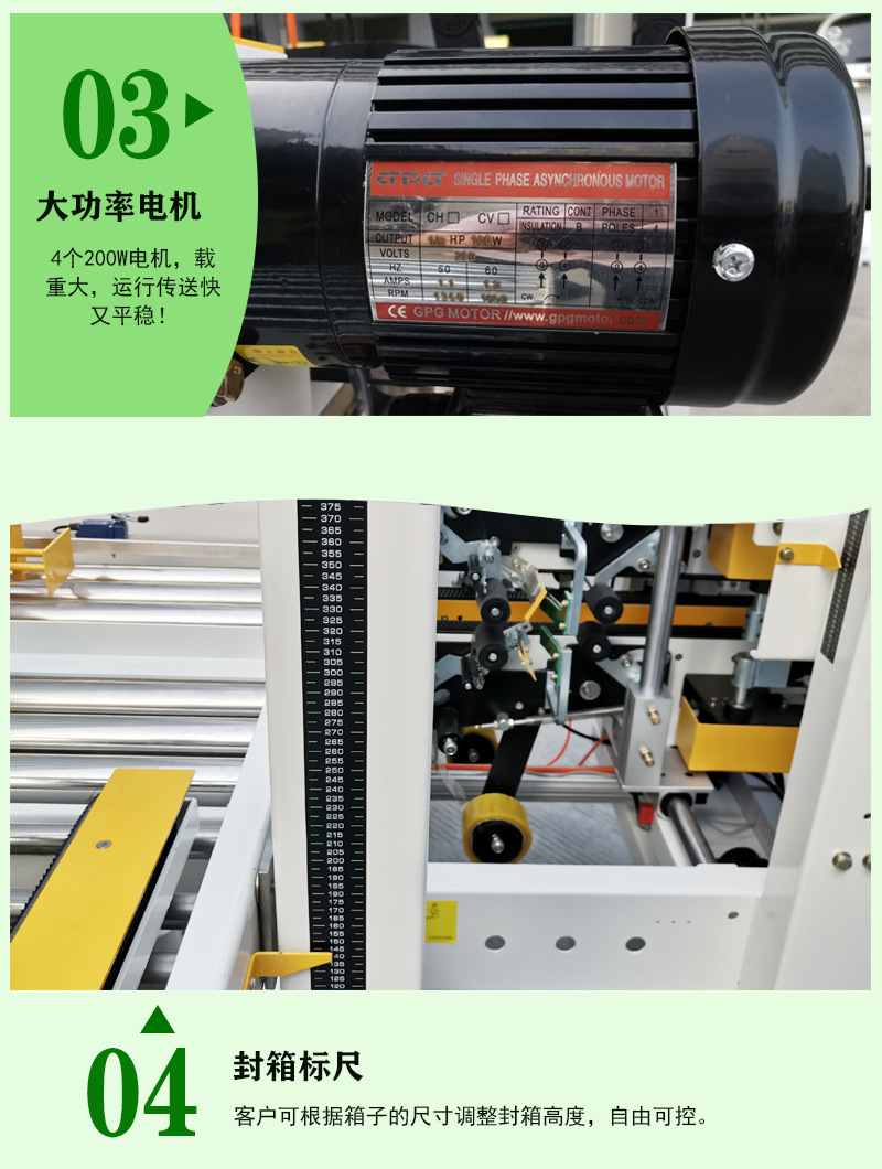 主要適用于紙箱的封箱包裝,既可單機(jī)作業(yè),也可與流水線配套使用,它可單箱作業(yè),也可與紙箱成型開(kāi)箱機(jī)、裝箱機(jī)、貼標(biāo)機(jī)、捆包機(jī)、棧板堆疊機(jī)、輸送機(jī)等設(shè)備配套成包裝流水線使用,為包裝流水線作業(yè)必須的設(shè)備。封箱機(jī)為錦岸代理產(chǎn)品主要分為:自動(dòng)拆蓋封箱機(jī)系列,氣動(dòng)調(diào)整封箱機(jī)系列,自動(dòng)封箱機(jī)系列,邊角式封箱機(jī)系列,四角邊封箱機(jī),工字型封箱等,封箱方式可分為:上下驅(qū)動(dòng),左右驅(qū)動(dòng),側(cè)邊,角邊等,一般采用透明膠帶以及牛皮紙材料。