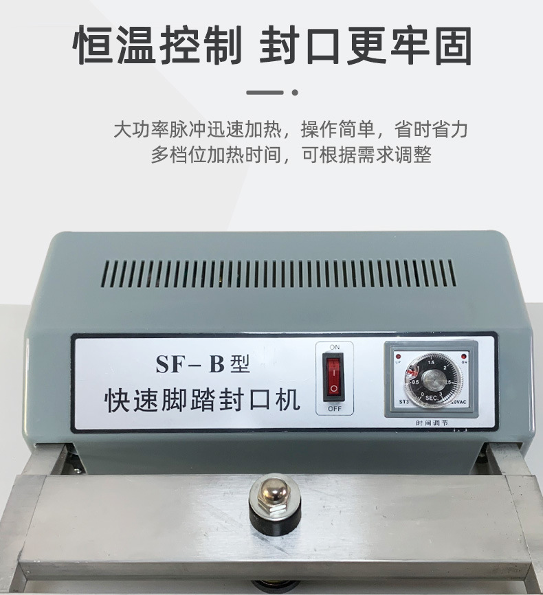 腳踏封口機是一種理想的封口設備,?適用于各種塑料袋薄膜的封口及制袋。?它特別適用于醫藥、?農藥、?食品、?日化、?潤滑油等行業的鋁箔袋、?塑料袋、?復合袋的封口。?這種設備利用電氣脈沖技術,?能夠顯著縮短封口時間,?從原來的2-4秒縮短至0.2秒,?具有投資少、?效益高、?封口長度長、?操作簡單等特點。?因此,?腳踏封口機被廣泛應用于食品、?醫藥、?土特產、?電器軟件、?工廠、?商店、?服務行業等領域,?成為這些行業中不可或缺的封口設備