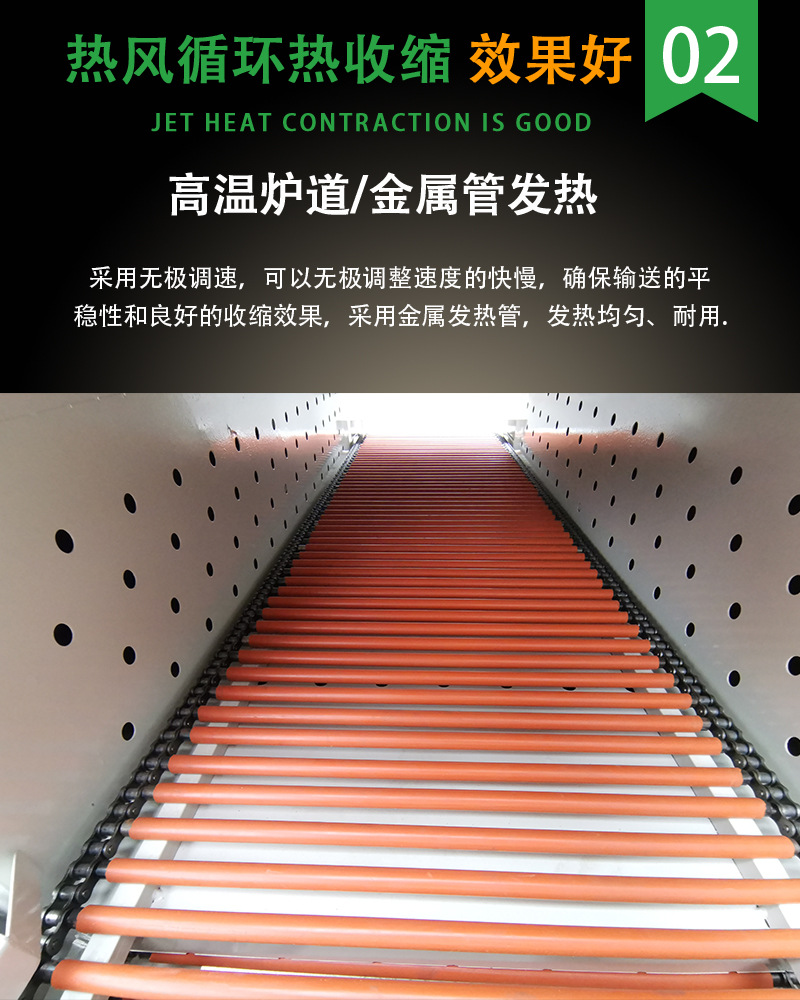 - 加熱收縮:當物品被薄膜包裹后,隨著輸送帶的移動,進入加熱區(qū)域。加熱區(qū)域設置有加熱元件(如電熱絲、石英管等),會產(chǎn)生高溫。熱收縮薄膜在高溫作用下,分子鏈發(fā)生運動,薄膜開始收縮,緊密地貼合在物品表面,從而完成包裝過程。在加熱過程中,需要控制好加熱溫度、時間以及輸送帶的速度等參數(shù),以確保收縮效果良好且不會對物品造成損壞。
