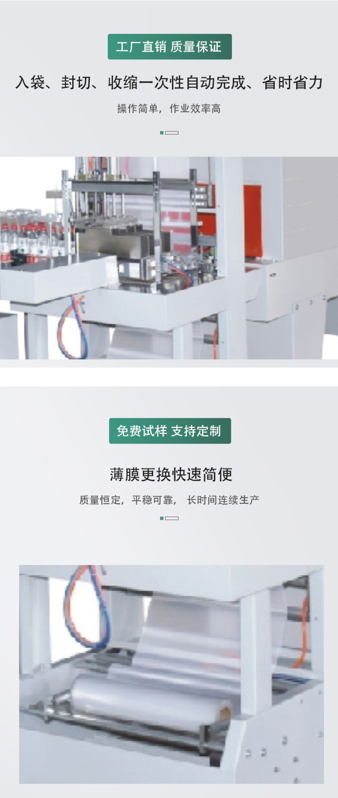 - 包裝質量好:通過精確的機械結構和合理的封口方式,能夠保證包裝的密封性和牢固性。特別是對于一些需要防潮、防氧化的產品,袖口式包裝機能夠提供良好的包裝保護。