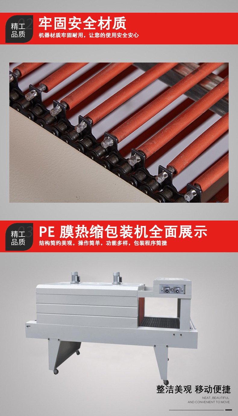 包裝質(zhì)量高:PE 熱收縮包裝機(jī)能夠使 PE 薄膜緊密地貼合產(chǎn)品,包裝后的產(chǎn)品外觀整潔、美觀,沒有褶皺。由于 PE 薄膜本身具有良好的柔韌性和透明度,包裝后的產(chǎn)品可以清晰地展示其形狀和外觀,同時也能有效地防止灰塵、水分等進(jìn)入產(chǎn)品,起到很好的保護(hù)作用。