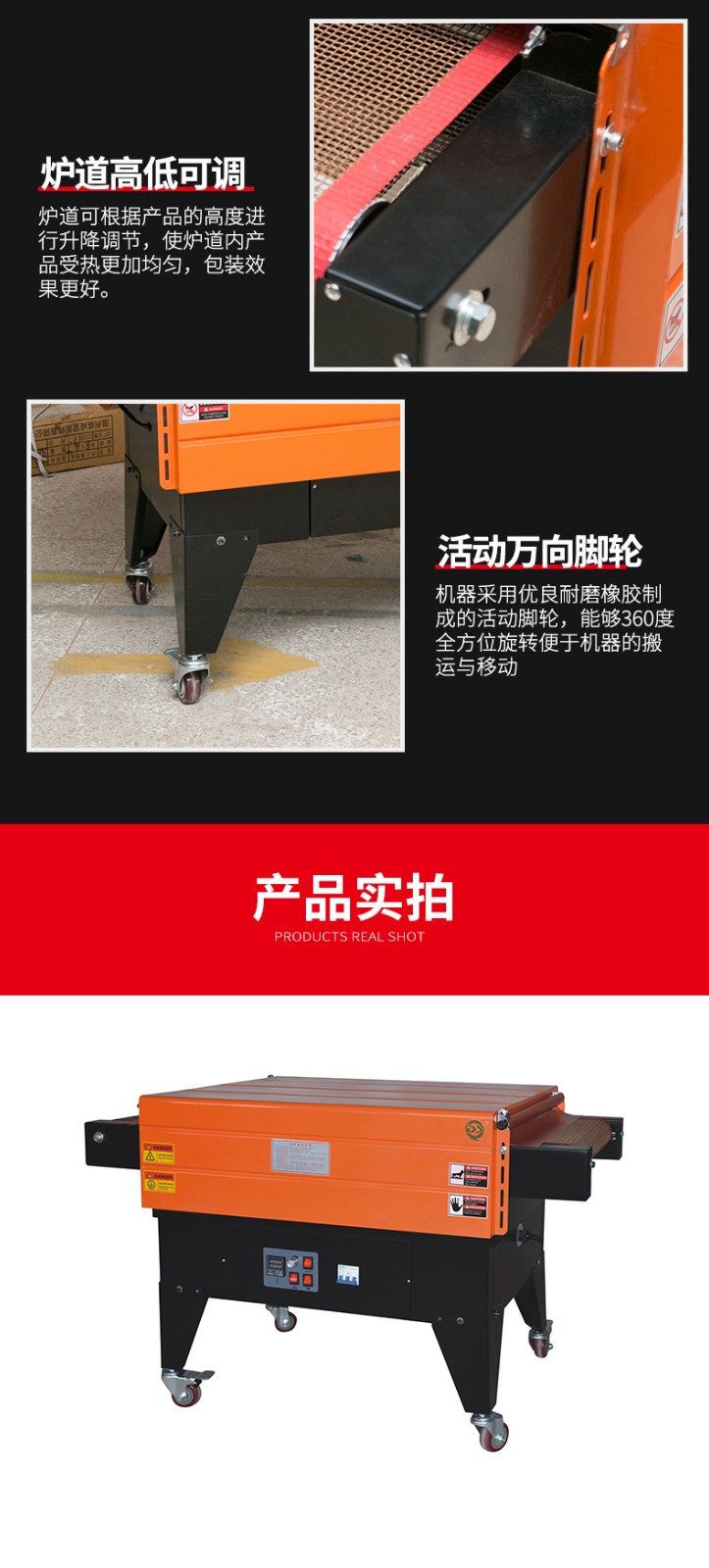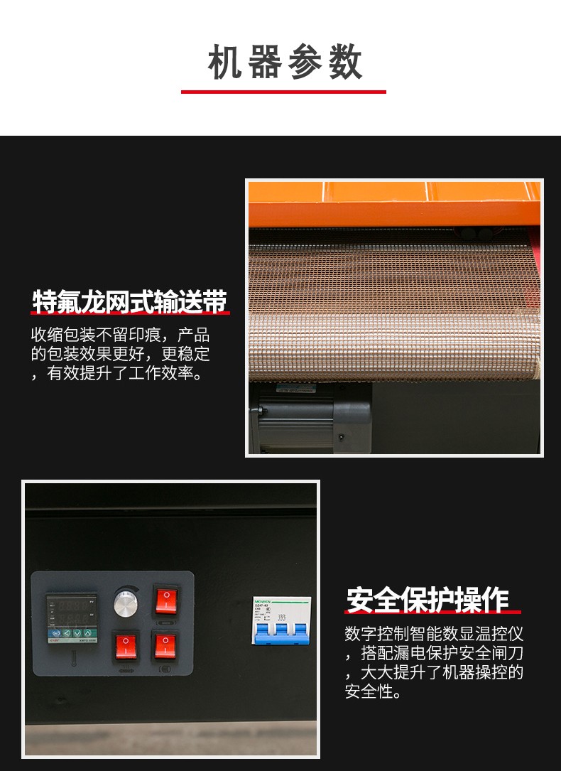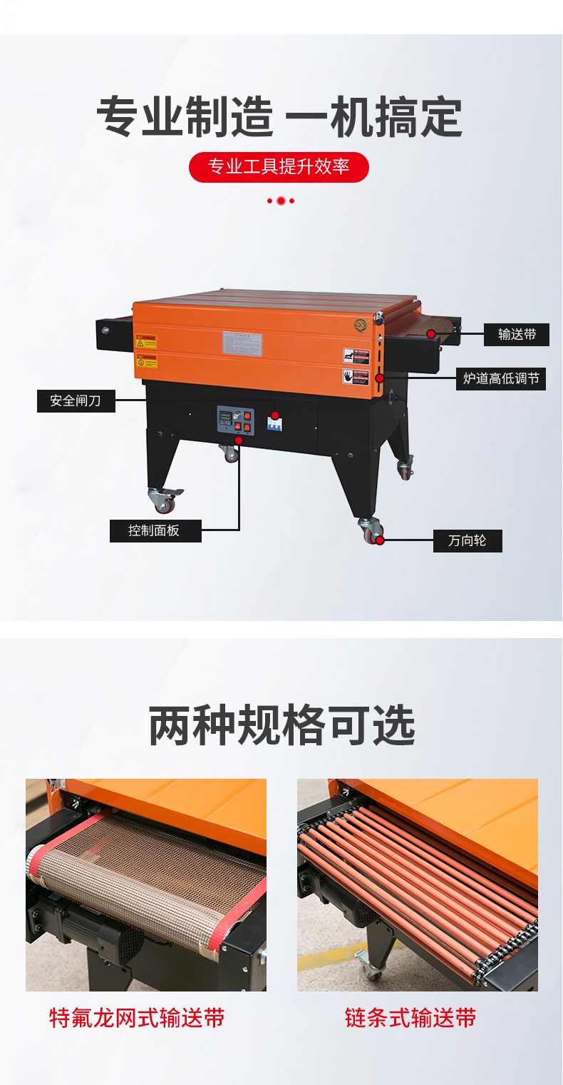- 包括輸送帶和驅動電機等部分。輸送帶用于將產品平穩地輸送通過熱空氣噴射區域,其速度可以調節。這樣可以根據不同的包裝速度要求和產品尺寸來控制產品在機器中的停留時間。例如,對于較小的產品,如糖果,可以加快輸送帶速度,提高包裝效率;而對于較大的產品,如家電產品的配件,輸送帶速度可以適當減慢,以保證薄膜有足夠的時間進行收縮。