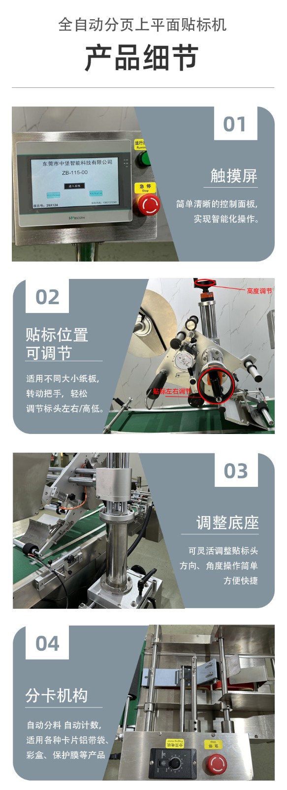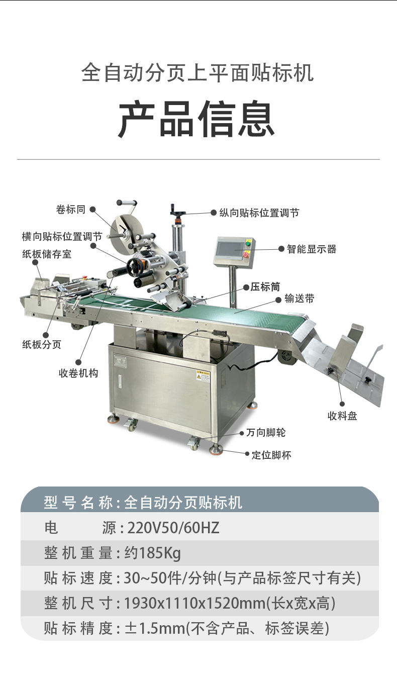 分頁原理:通常利用摩擦、靜電或氣流等方式將一疊標簽或卡片等物料逐張分離。例如摩擦式分頁,通過一組帶有摩擦力的滾輪,當滾輪轉動時,與最上面的一張標簽產生摩擦力,將其從整疊標簽中分離出來,送入貼標流程。 貼標原理:一般是先由供標機構將標簽從標簽卷上剝離下來,然后通過貼標頭將標簽準確地貼附到待貼標的產品或包裝上。在貼標過程中,會有傳感器來檢測產品的位置和運動狀態,確保標簽貼在正確的位置上。 結構組成 分頁機構:如前面提到的滾輪式分頁裝置,或者采用真空吸附式分頁的吸盤等部件,實現物料的逐張分離。 貼標機構:包括標