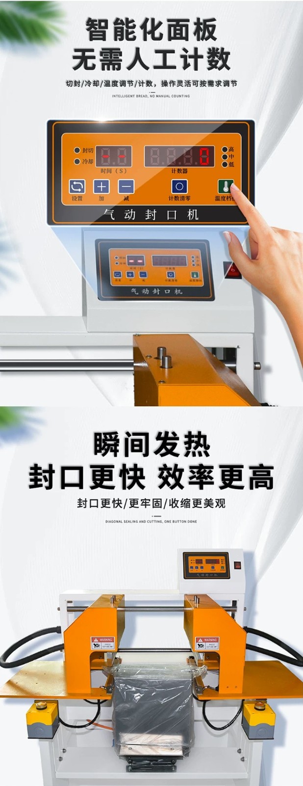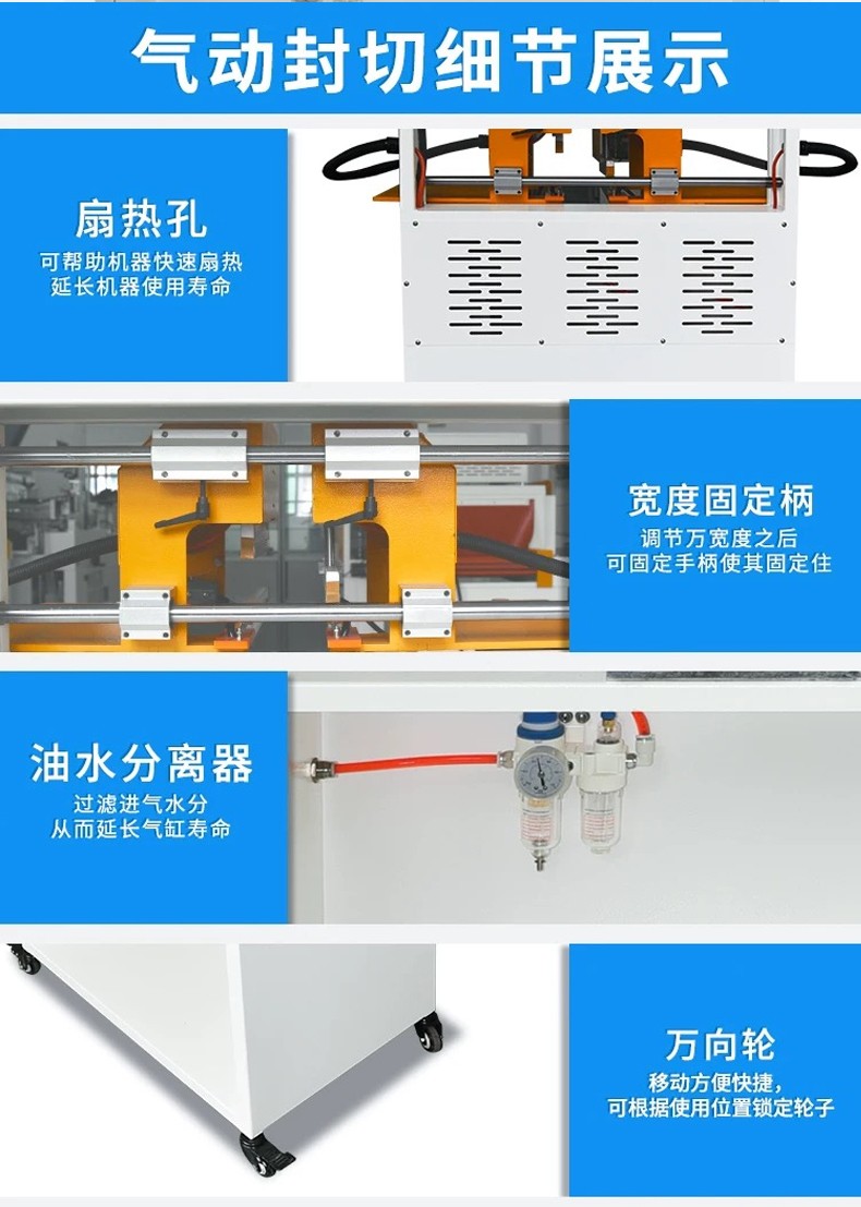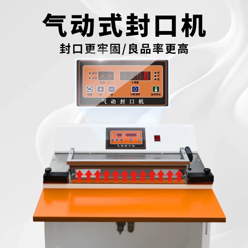 • 氣動封口:利用壓縮空氣驅動氣缸,帶動封口部件運作。電器脈沖技術使發熱元件發熱,在熱量和壓力共同作用下,實現包裝材料的封口。