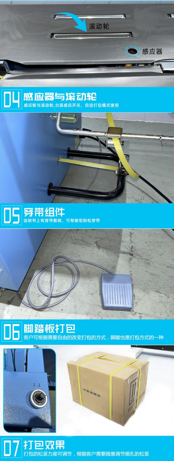 控制系統:負責智能化管理整個捆扎流程。通過傳感器與程序控制,實時監測并調整捆扎速度、張力等參數,用戶還能依不同產品需求設定相應捆扎參數,滿足多樣化包裝需求。