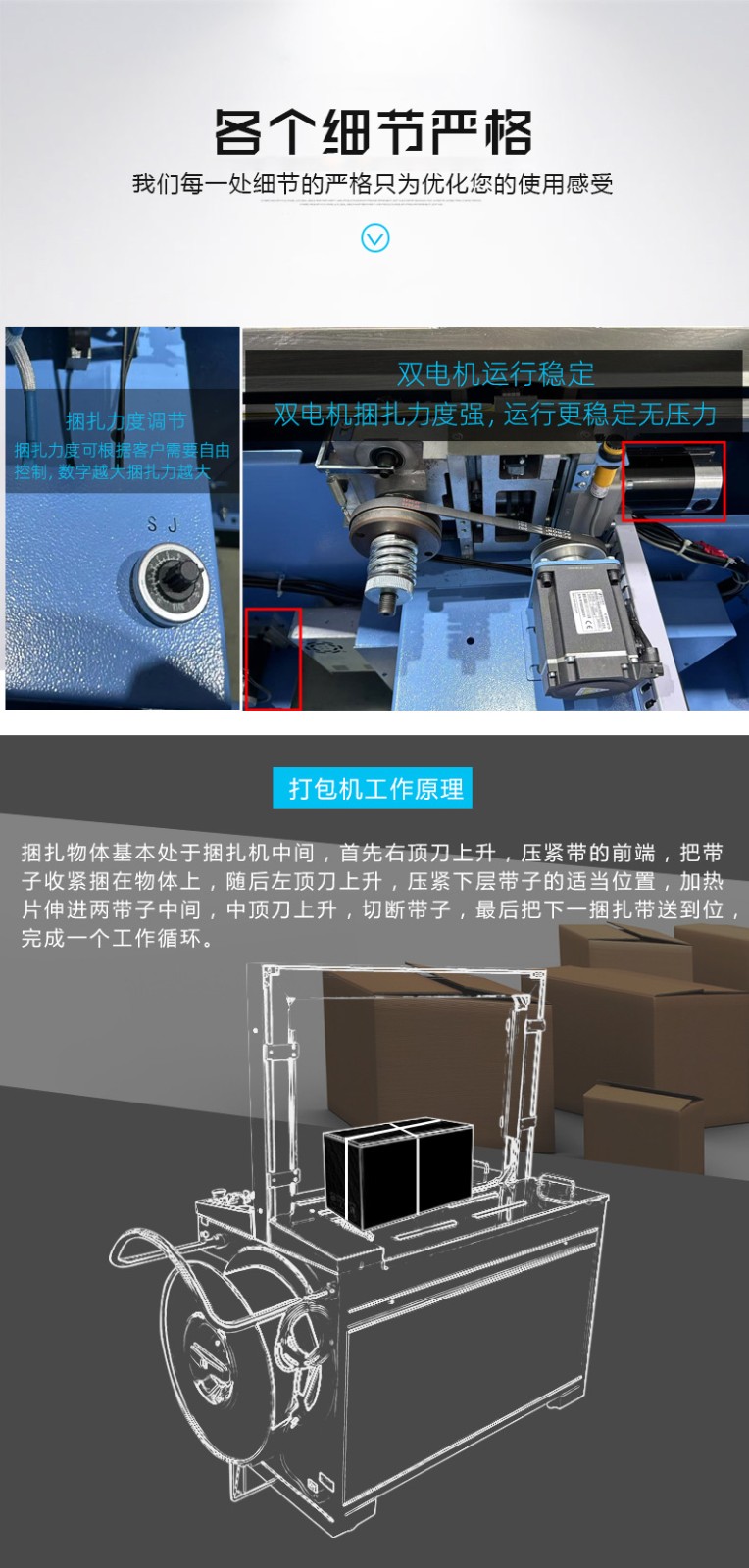 - 捆扎打包:根據預設的參數,伺服電機驅動打包帶圍繞物品進行捆扎。在捆扎過程中,伺服電機精確控制打包帶的張力,確保打包帶能夠緊密地貼合在物品表面,同時又不會對物品造成損壞。完成捆扎后,切斷機構會自動將打包帶切斷,并對末端進行熱封或其他方式的處理,防止打包帶松開。