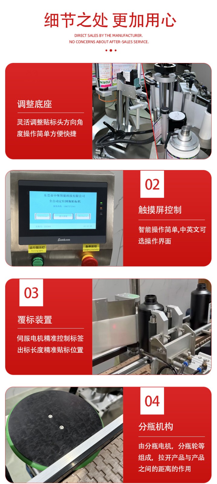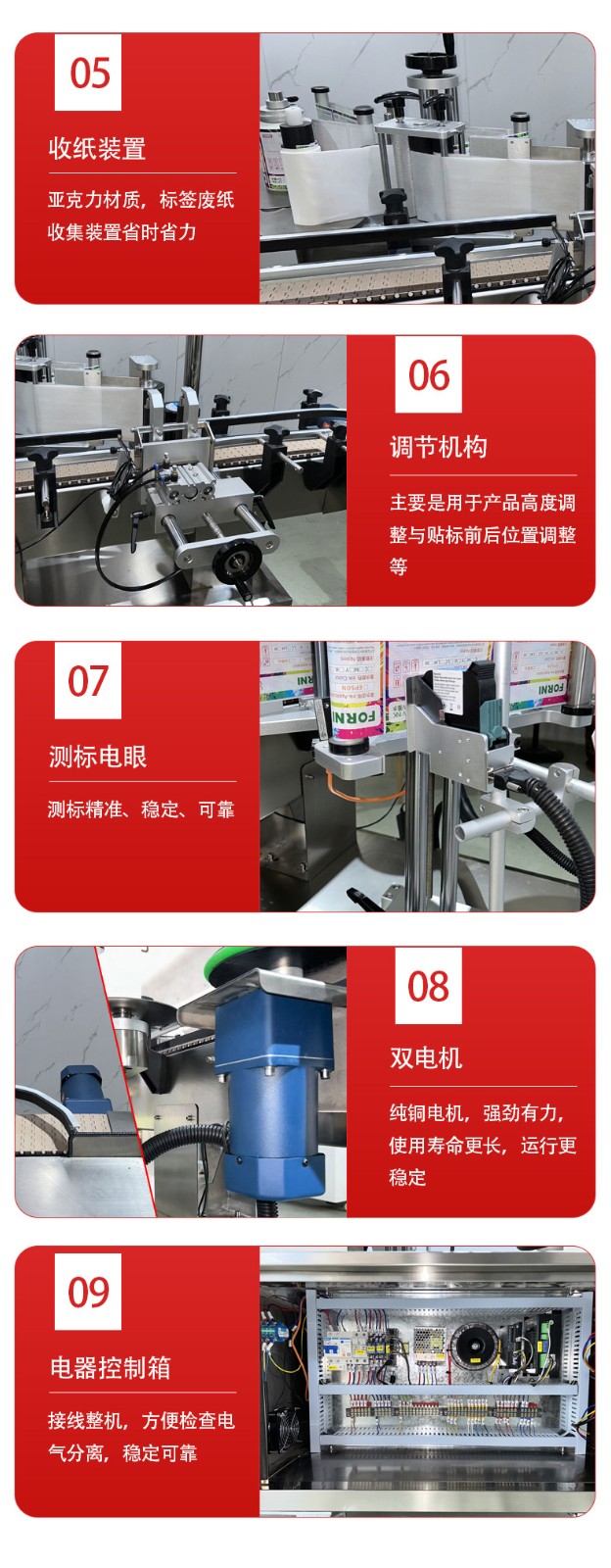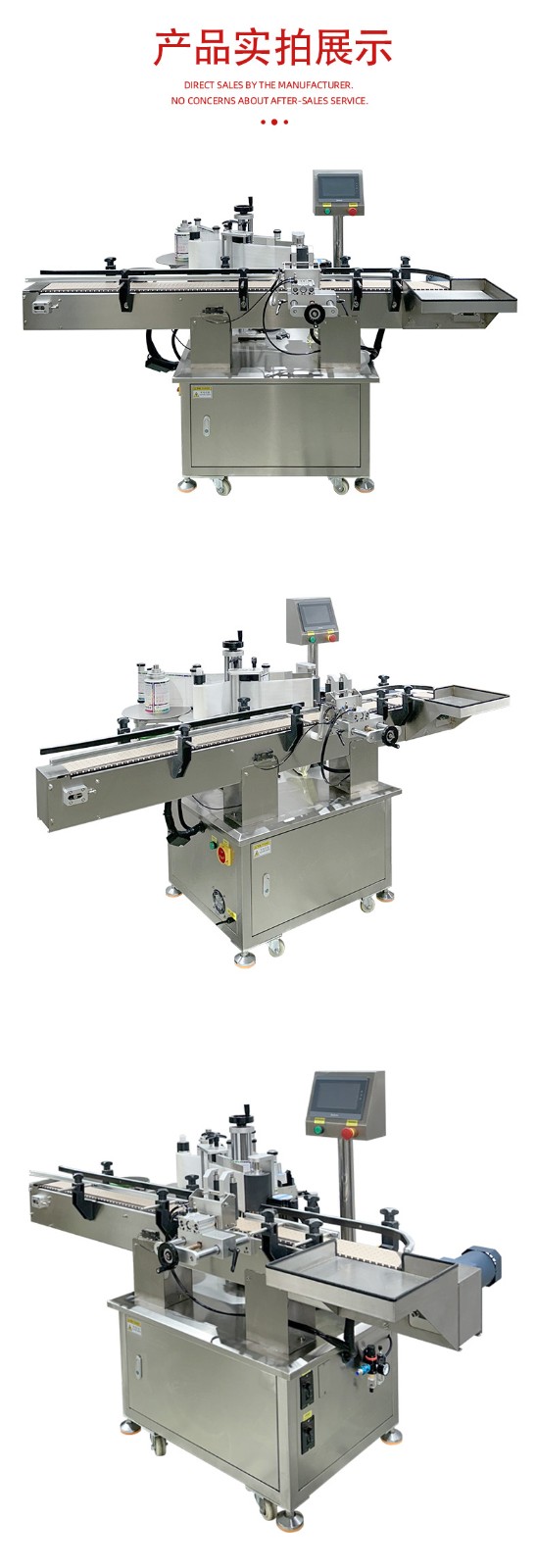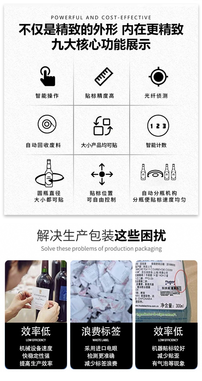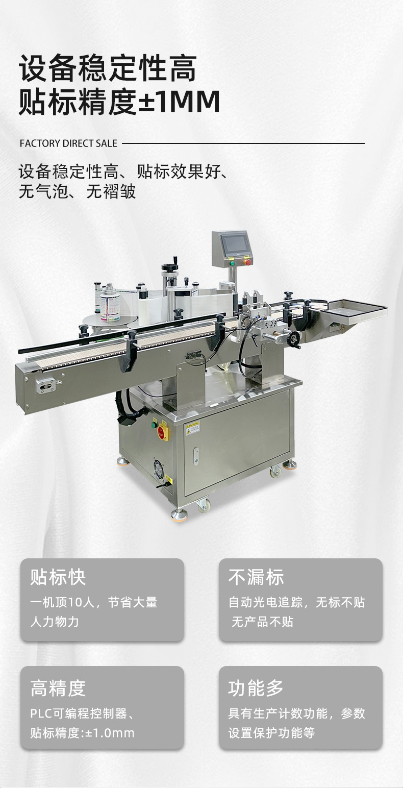 貼標功能:可在圓瓶的圓周面、圓錐面、雙側面等位置進行貼標,可貼單標或雙標,正背雙標間距可靈活調整。
