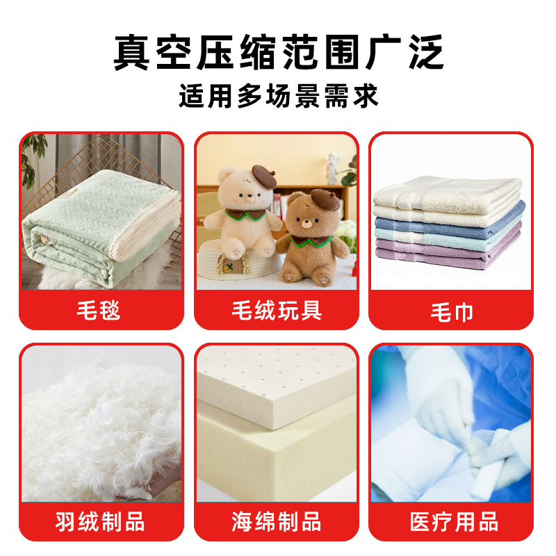 - 家居用品:用于羽絨被、棉被、枕頭、毛絨玩具等蓬松物品的收納包裝,可大大節省存儲空間,使家居環境更加整潔有序。