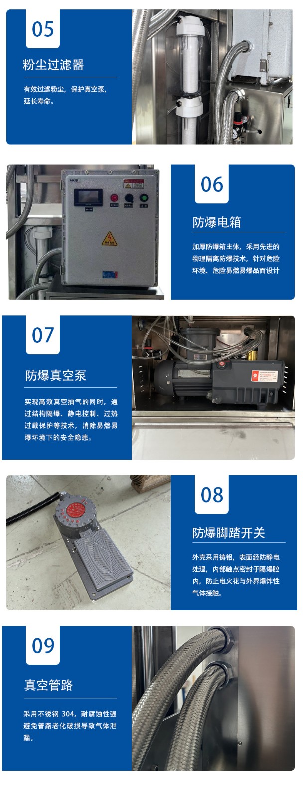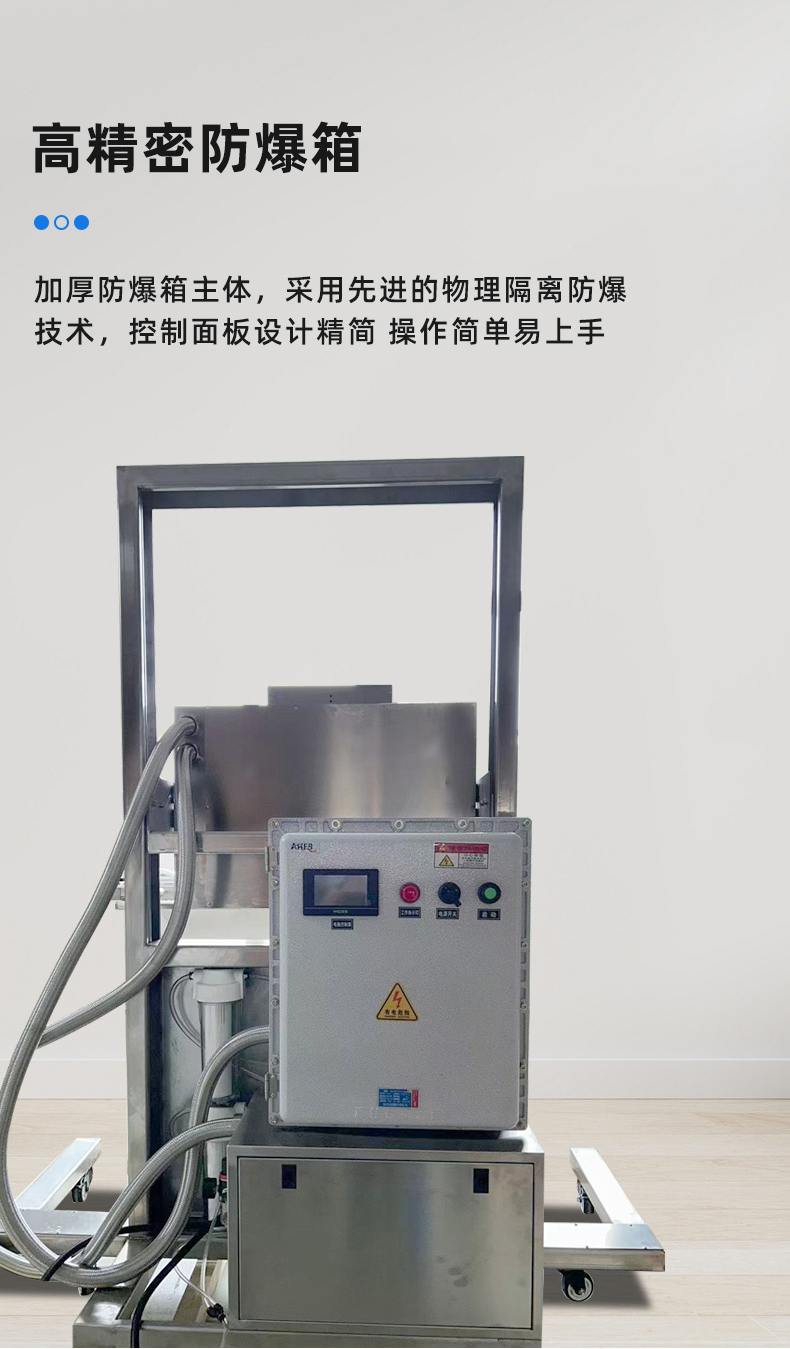 • 防爆性能優(yōu)越:采用物理隔離防爆技術,嚴格選用防爆達標元件,電器箱、真空泵、熱封條等都經(jīng)過特殊的防爆處理,能有效防止在操作過程中產(chǎn)生火花,避免爆炸等危險情況的發(fā)生2