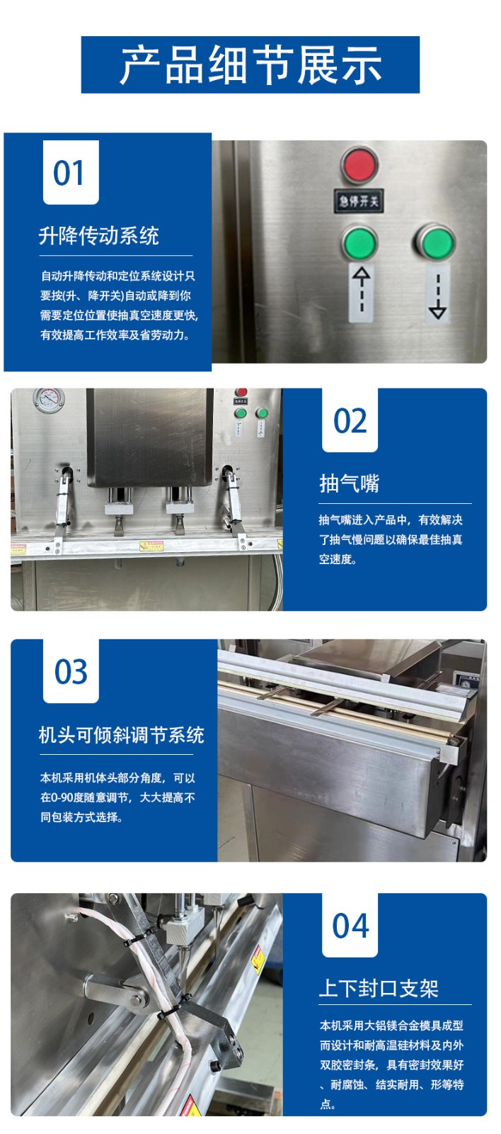 • 操作簡便:通常配備 PLC 觸摸屏控制,人機交互界面友好,操作簡單直觀,工作人員可以方便地設置各種參數(shù),如真空度、封口溫度、封口時間等,降低了操作難度,提高了工作效率