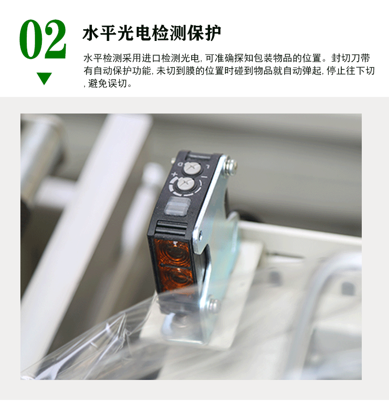· 配有進(jìn)口檢測光電,水平、垂直檢測各一組,便于切換選擇,對于薄與小的包裝物,可輕易完成封口包裝作業(yè)。