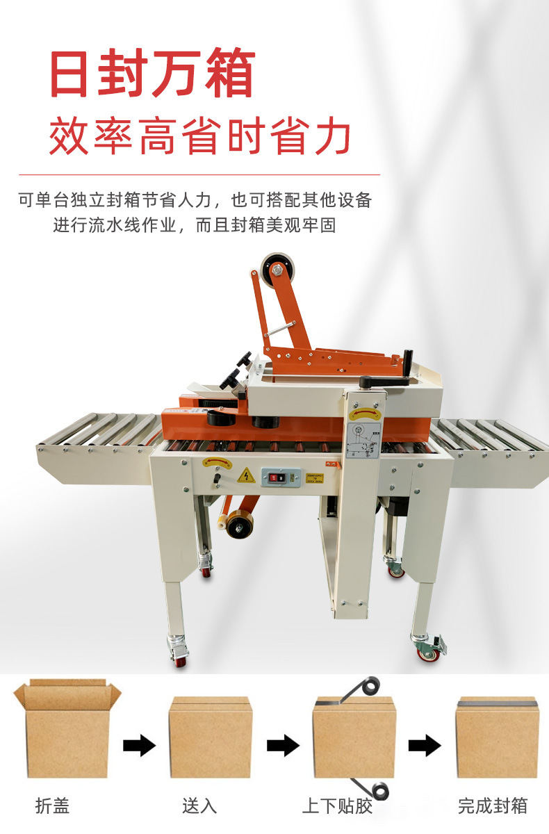 封箱機是一種用于紙箱封箱包裝的設備,主要適用于紙箱的封箱包裝,既可單機作業,也可與流水線配套使用。它可單箱作業,也可與紙箱成型開箱機、裝箱機、貼標機、捆包機、棧板堆疊機、輸送機等設備配套成包裝流水線使用,為包裝流水線作業必須的設備。封箱機的主要分類包括自動拆蓋封箱機系列、氣動調整封箱機系列、自動封箱機系列、邊角式封箱機系列、四角邊封箱機、工字型封箱等,封箱方式可分為上下驅動、左右驅動、側邊、角邊等,一般采用透明膠帶以及牛皮紙材料。