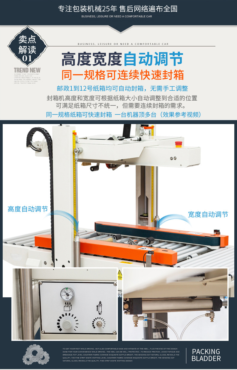 封箱機,也稱為Case sealer machine,主要用于紙箱的封箱包裝。它們不僅適用于單機作業,也可以與流水線配套使用,是包裝流水線作業中不可或缺的設備。封箱機的功能包括自動折疊、粘合和封口紙箱,通過先進的感應和控制技術,能夠自動檢測和調整紙箱尺寸,按照設計要求進行折疊和封口操作,大大提高了包裝的效率和一致性,減少了人工操作的錯誤和勞動強度。