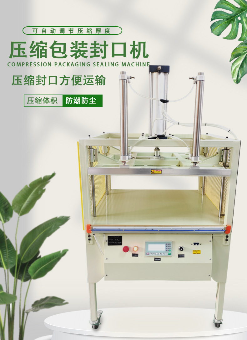 壓縮包裝封口機適用于壓縮包裝羽絨被服、太空棉被服、枕頭、發泡棉、毛巾等蓬松的其它物品。可縮小包裝的物品及防潮防塵