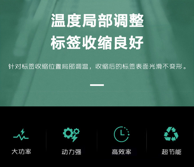 標簽熱收縮機的主要功能特點包括智能控制收縮溫度、?無級調整輸送速度、?確保輸送平穩、?360度旋轉受熱以確保收縮均勻。?