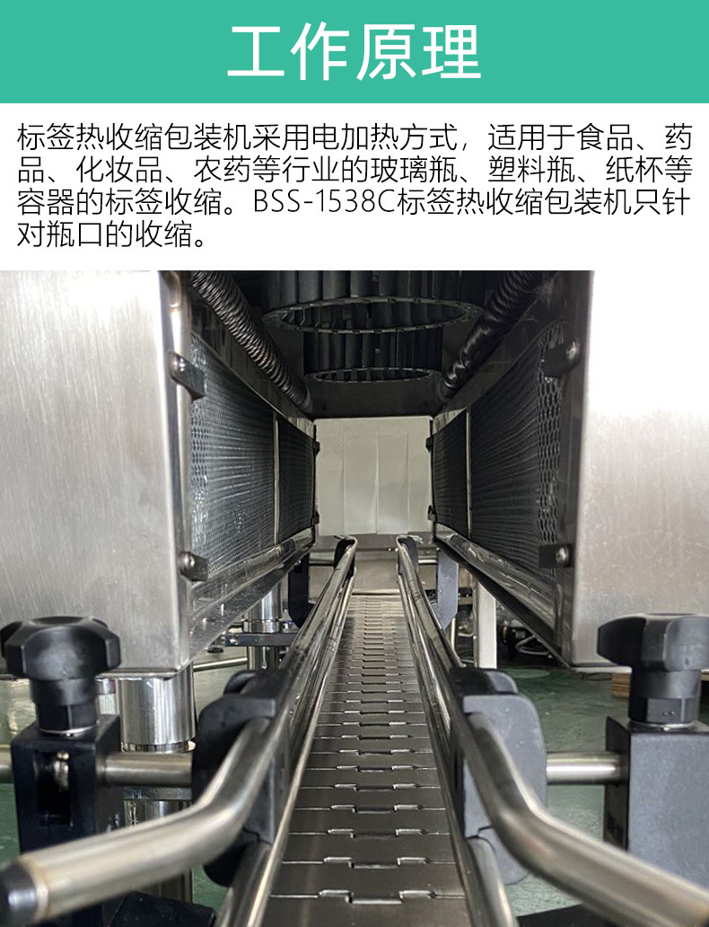 標簽熱收縮機是一種專門針對瓶狀、?罐狀、?桶狀杯狀產品的標簽進行收縮的設備,?能夠收縮瓶口、?瓶身、?瓶底以及整體。?它具有以下特點:?